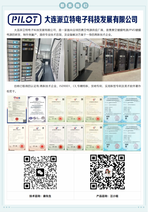 大連派立特電子科技發(fā)展有限公司,是一家面向全球的真空電源供應(yīng)廠商,是集真空鍍膜電源/PVD鍍膜電源的研發(fā)、制作到量產(chǎn),提供專業(yè)技術(shù)咨詢,及設(shè)備解決方案于一身的高新技術(shù)企業(yè)。 主要在售電源品類如下,已廣泛應(yīng)用于諸多業(yè)內(nèi)頭部企業(yè)并得到高度認(rèn)可,支持按需定制: 多弧電源 燈絲電源 清洗電源 轟擊電源 靜電吸附電源 脈沖弧電源 中頻濺射電源 脈沖偏壓電源 離子源電源 直流磁控濺射電源 直流脈沖濺射電源 and so on... 目前已取得的認(rèn)證有:高新技術(shù)企業(yè),ISO9001,CE,專精特新,發(fā)明專利、實(shí)用新型專利及美術(shù)、軟件著作權(quán)若干。